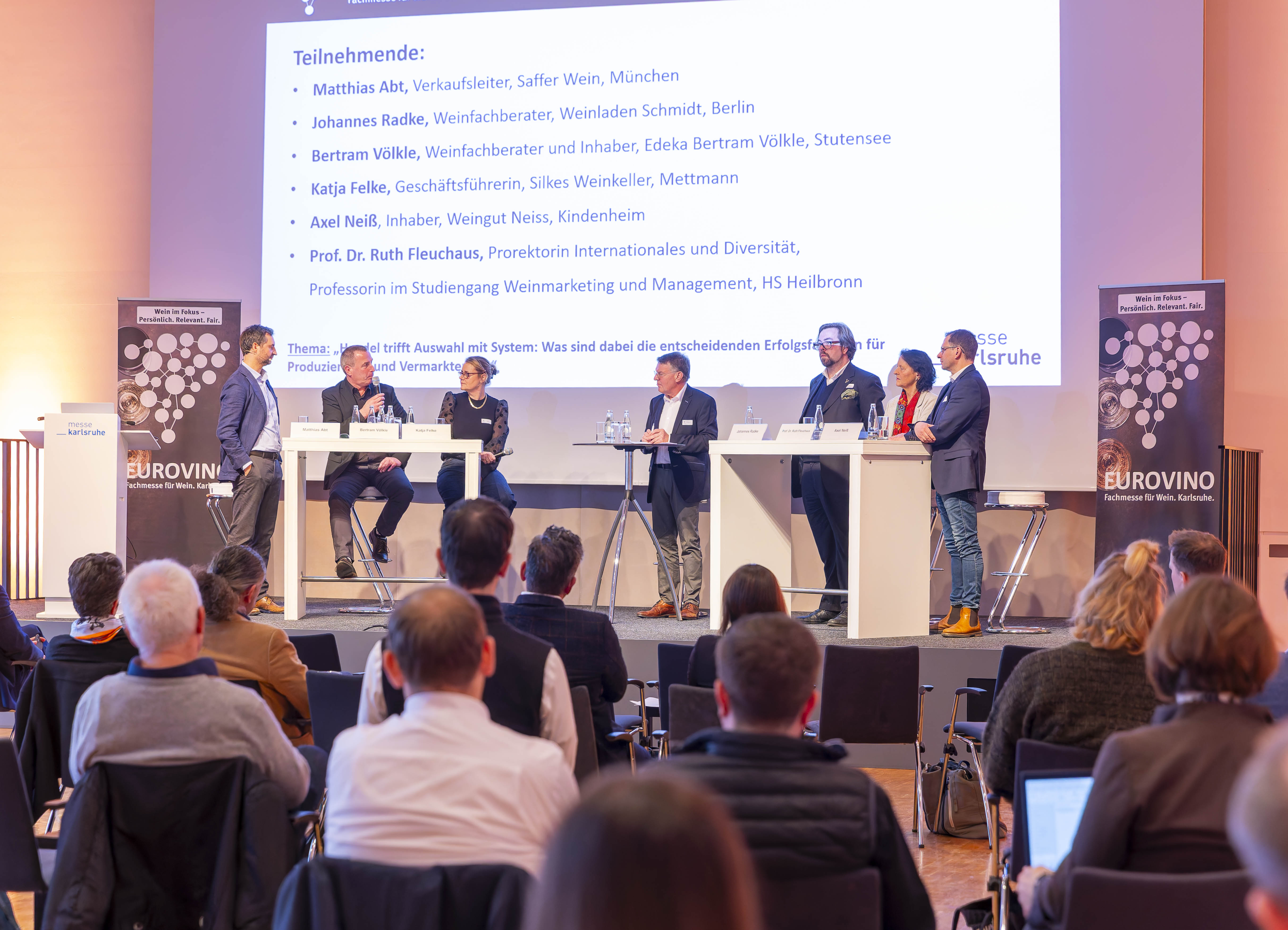 Anknüpfend an die Keynote widmete sich die erste Talkrunde mit dem Schwerpunkt Handel unter Moderation von Dr. Hermann Pilz, Beiratsvorsitzender der EUROVINO, folgender Fragestellung „Handel trifft Auswahl mit System: Was sind dabei die entscheidenden Erfolgsfaktoren für Produzierende und Vermarktende?“